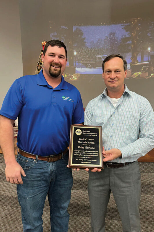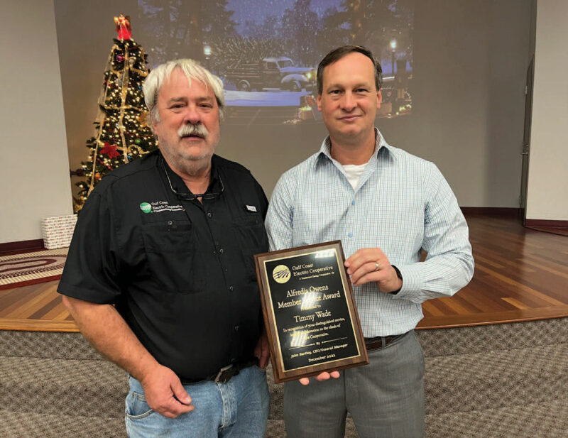 3 Gulf Coast Electric Cooperative employees received special awards named in memory and honor of former employees, and several others were recognized for service anniversaries at a December 14 gathering. Gulf Coast Electric Cooperative CEO/General Manager John Bartley presents employee awards in memory and honor of former employees.