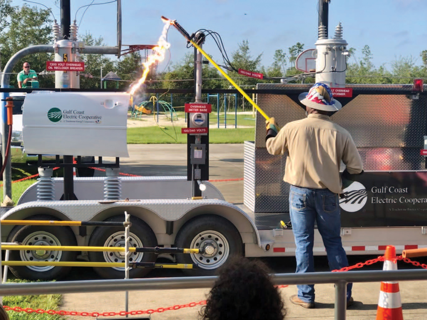 The presentation began with an overview of the safety equipment linemen are required to wear. Linemen then demonstrated what happens when squirrels and a ladder make contact with an energized line. An energized car door offers a powerful lesson on why you do not walk up and attempt to help someone in a car that has energized lines on it.