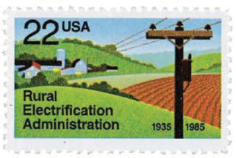 A 22-cent stamp designed by illustrator Howard Koslow commemorated the 50th anniversary of the Rural Electrification Administration in 1985. Roughly an inch by an inch and a half, it frames a rural scene with an electric co-op pole in the foreground and a family farm in the distance. Electric lights glow from the windows of the farmstead and barn. Image courtesy of the National Rural Electric Cooperative Association